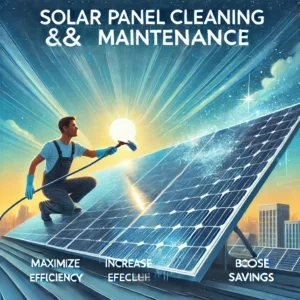 DALL·E 2024-10-13 18.32.40 – A professional cleaning solar panels on a rooftop, with sparkling clean panels reflecting sunlight, surrounded by a clear blue sky. The scene emphasiz